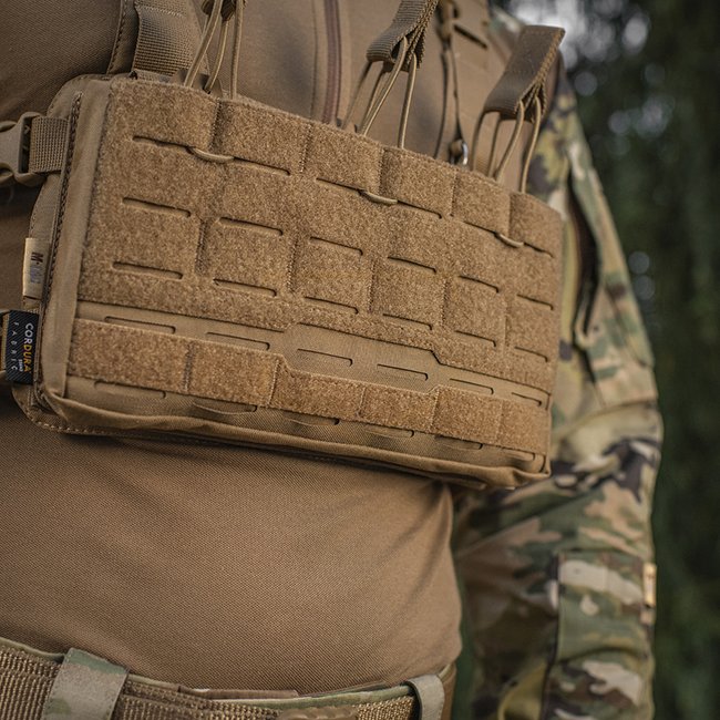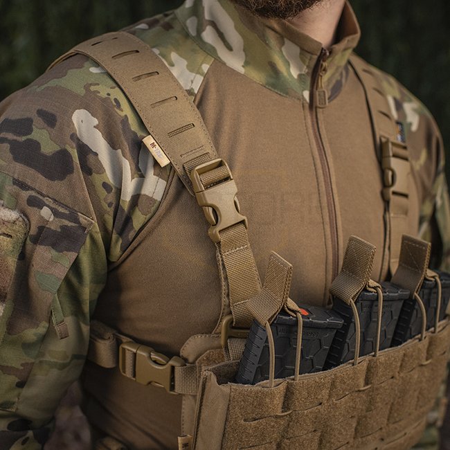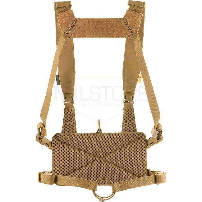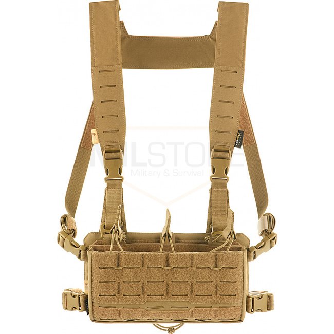 Gilet de poitrine modulaire - Coyote, de haute qualité et durable en Cordura 500D conçu pour trois magazines avec boucles à libération rapide. Système de harnais en forme de H pour le confort et la ventilation.
