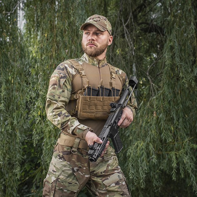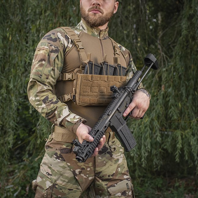 Le Modular Chest Rig est un Chest Rig tactique qui allie polyvalence et confort. Fabriqué en matériau Cordura 500D de haute qualité et durable. Le panneau avant est conçu pour trois magazines et est solidement fixé à la base à l'aide de crochets Woojin et de velcro. Des sangles spéciales fixent les magazines et les empêchent de perdre accidentellement. La surface frontale du système MOLLE permet de fixer un équipement supplémentaire. De plus, ce panneau peut être retiré et remplacé par tout autre insert modulaire compatible avec la fermeture Velcro.