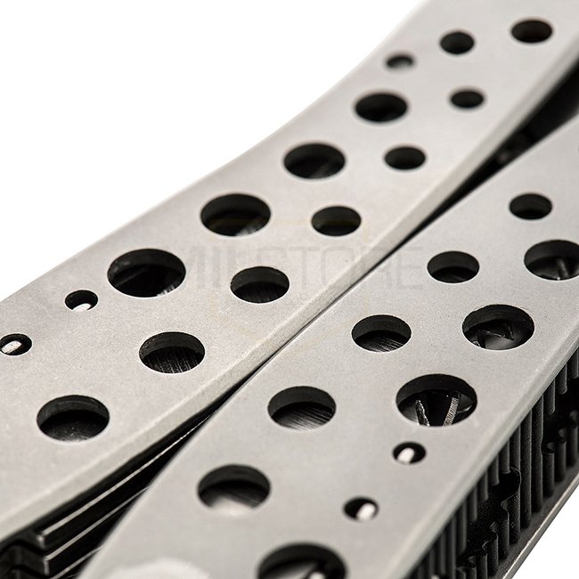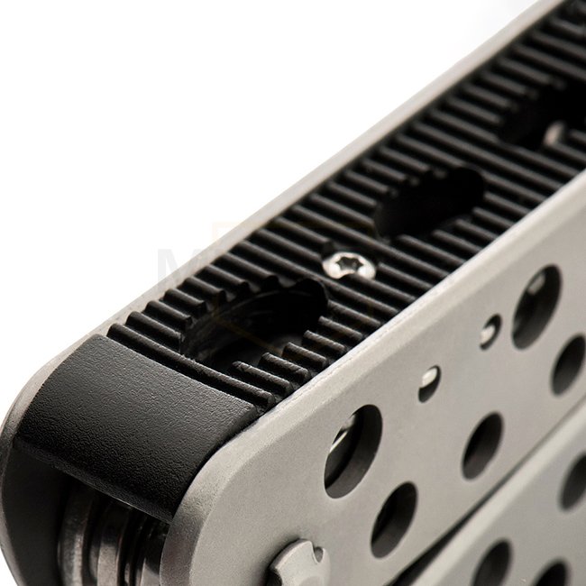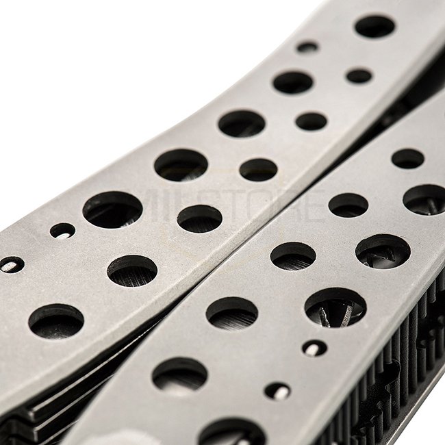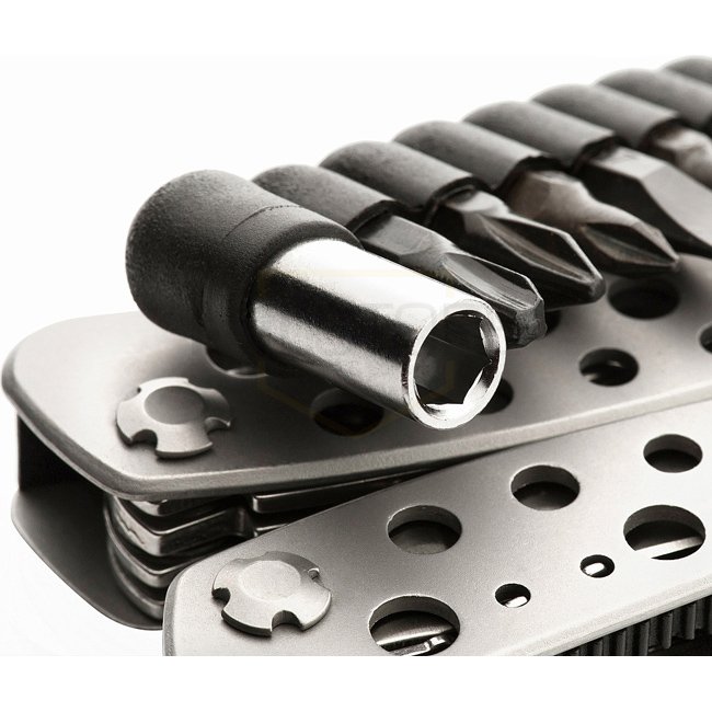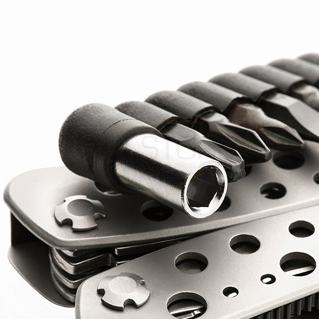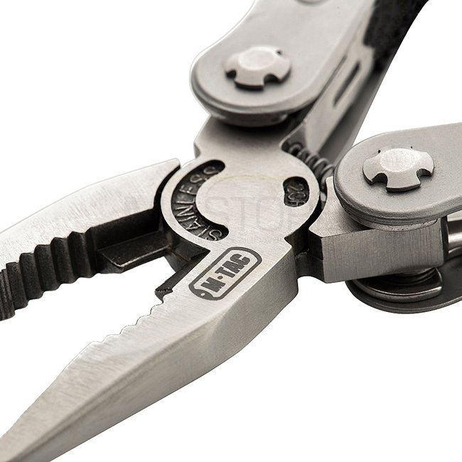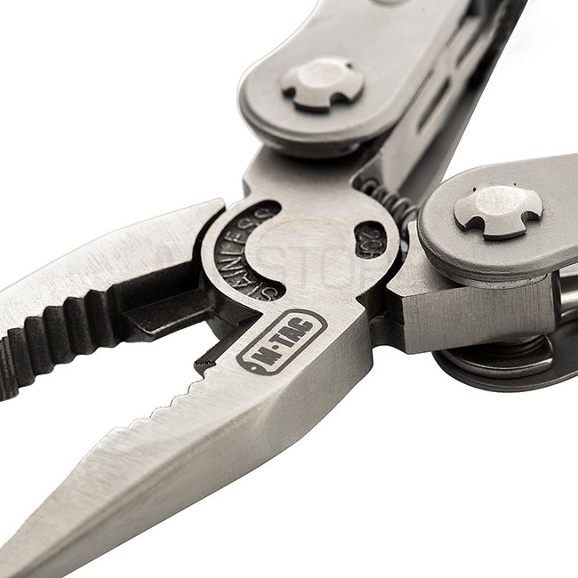 Multitool de haute qualité, fiable et relativement peu coûteux. Le kit comprend les outils les plus nécessaires et les plus souhaités pour un usage quotidien : pinces et pinces coupantes, tournevis, scies, ouvre-boîtes et ouvre-bouteilles, et même une lime, le tout dans un ensemble compact et pratique qui ne prend pratiquement pas de place lorsqu'il est fermé.