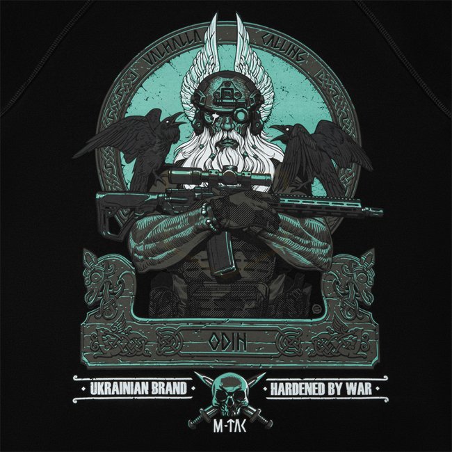 M-Tac Odin Mystery Raglan - Noir - 2XL : T-shirt à manches longues sur le thème du dieu suprême Odin, représentant Odin en tenue de combat avec un fusil AR-15, accompagné des corbeaux Hugin et Munin. Inscription "Valhalla Calling". Fabriqué en tissu de ha