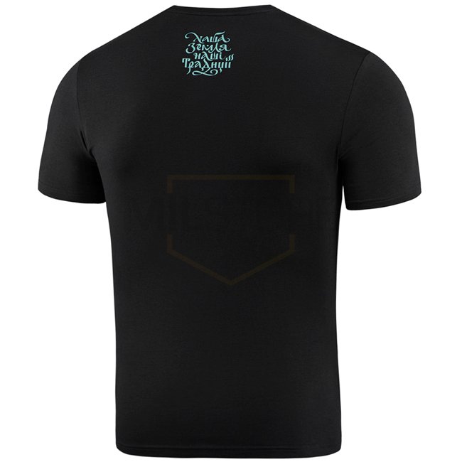 T-shirt M-Tac Our Land présentant un soldat moderne à côté de symboles de sagesse, de loyauté, de force, de courage, et d'intelligence militaire. Fabriqué dans un tissu de haute qualité (93% coton, 7% élasthanne), ce tee-shirt confortable incarne la bravo