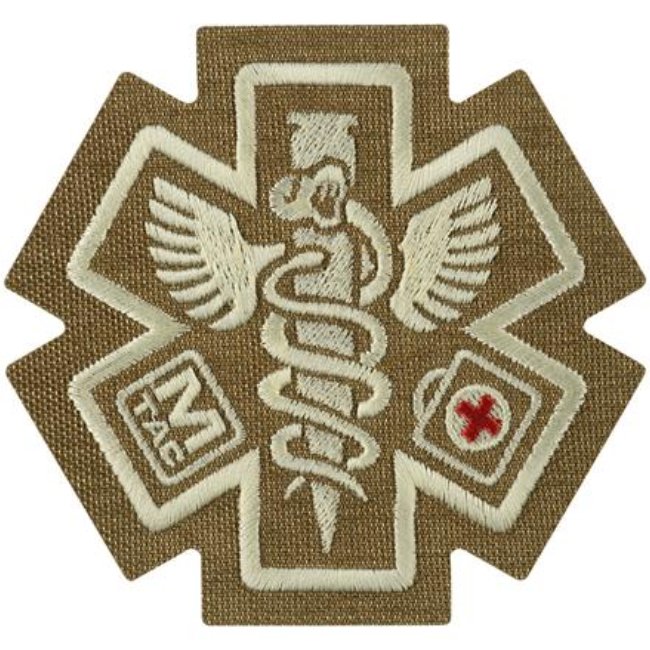 Patch de broderie M-Tac Paramedic - Coyote, fabriqué en Cordura 500D à l'avant et doté d'une surface à crochet à l'arrière. Dimensionné à 75 x 80 mm.