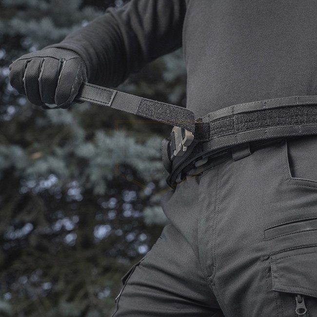 Fabriqué en sangle de nylon solide, résistant aux frottements et aux dommages mécaniques. À l'extérieur, il y a une interface MOLLE qui vous permet d'installer en toute sécurité des équipements supplémentaires. La ceinture est fixée avec une boucle spéciale Cobra 25 mm du fabricant autrichien AustriAlpin, qui peut résister aux charges les plus extrêmes. Il se ferme rapidement et se détache facilement en appuyant simultanément sur les loquets latéraux.