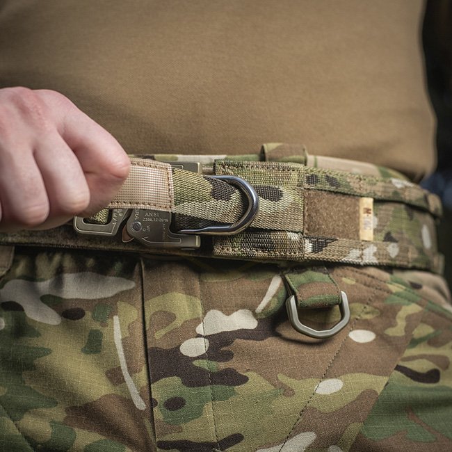 Fabriqué en sangle de nylon solide, résistant aux frottements et aux dommages mécaniques. À l'extérieur, il y a une interface MOLLE qui vous permet d'installer en toute sécurité des équipements supplémentaires. La ceinture est fixée avec une boucle spéciale Cobra 25 mm du fabricant autrichien AustriAlpin, qui peut résister aux charges les plus extrêmes. Il se ferme rapidement et se détache facilement en appuyant simultanément sur les loquets latéraux.