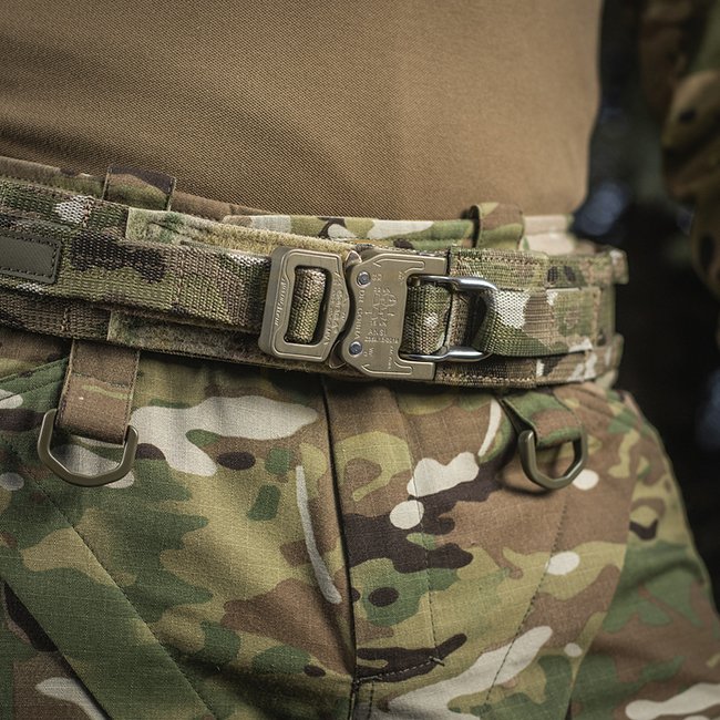 Fabriqué en sangle de nylon solide, résistant aux frottements et aux dommages mécaniques. À l'extérieur, il y a une interface MOLLE qui vous permet d'installer en toute sécurité des équipements supplémentaires. La ceinture est fixée avec une boucle spéciale Cobra 25 mm du fabricant autrichien AustriAlpin, qui peut résister aux charges les plus extrêmes. Il se ferme rapidement et se détache facilement en appuyant simultanément sur les loquets latéraux.