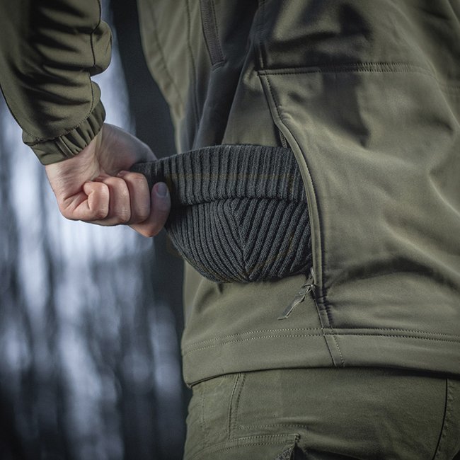 Veste Soft Shell M-Tac - Olive - L. Membrane en polyuréthane intermédiaire pour protection contre les intempéries. Légère et polyvalente avec une couche extérieure coupe-vent et une couche intérieure isolante. Tissu déperlant pour l'humidité et la saleté