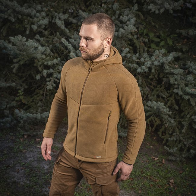 Restez au chaud et élégant avec le sweatshirt en polaire M-Tac Sprint Polartec en Coyote. Fabriqué en polaire Polartec 200 de qualité supérieure pour la durabilité, la rétention de chaleur et le confort. Manches raglan à capuche avec col haut pour une pro