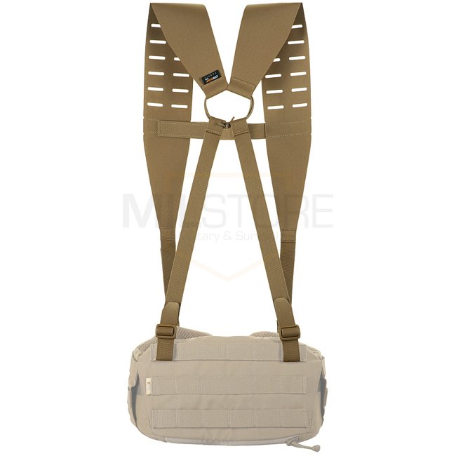 Ceinture tactique M-Tac avec sangles d'épaule, découpée au laser de couleur Coyote. Fabriquée en matériau Cordura durable. Ne pèse que 120g.