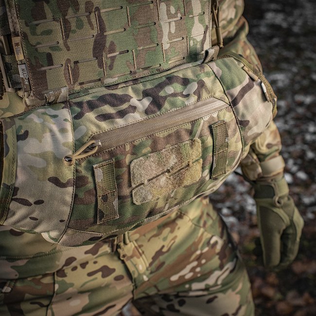 La poche avant avec une fermeture éclair AquaGuard étanche est parfaite pour ranger des documents, un téléphone portable, des bâtons lumineux et d'autres articles essentiels. Sur le devant se trouve un panneau Velcro pour les patchs et des sangles MOLLE pour un équipement supplémentaire.