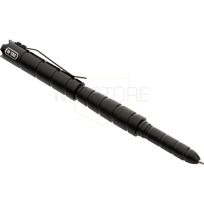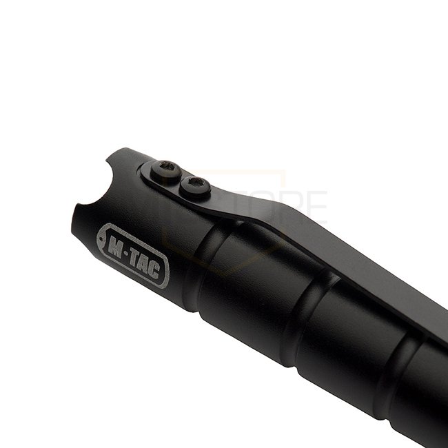 Stylo tactique M-Tac TP-17 - Noir : Un stylo en aluminium de qualité aéronautique durable avec une surface striée pour une meilleure prise, doté d'un briseur de verre et d'un capuchon avec pince.