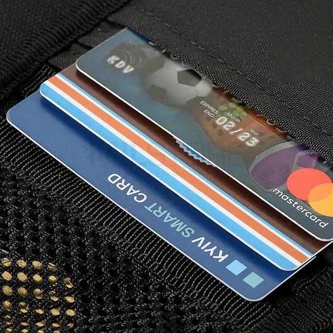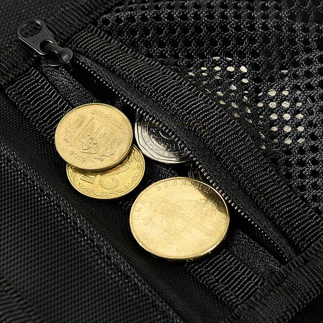 Il a deux grands compartiments pour les billets, des compartiments pour les cartes et des compartiments en plastique pour les documents. Il y a aussi une poche pour la monnaie, qui se ferme avec une fermeture éclair. Le panneau velcro avant vous permet d'attacher divers patchs.