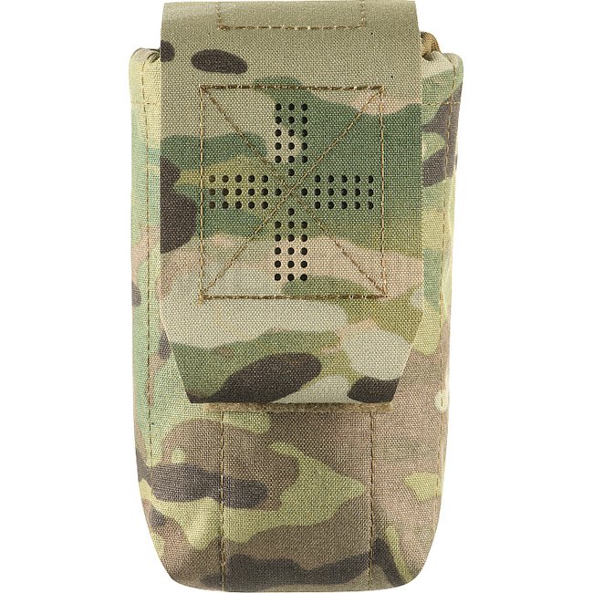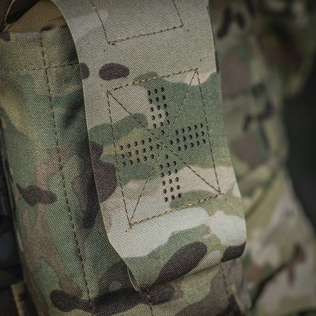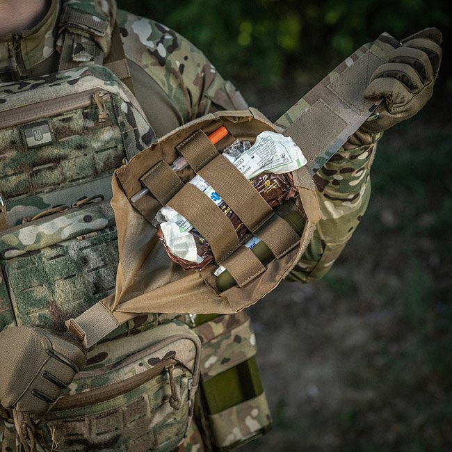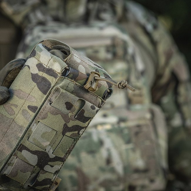 La pochette extérieure est en Cordura 500D - un matériau durable qui résiste à l'abrasion et aux charges élevées. Les parois latérales intérieures sont en nylon élastique, grâce auquel il conserve sa forme. Un élément de fixation supplémentaire est une sangle qui vous permet de maintenir en toute sécurité la trousse de premiers secours, même pendant l'activité. Se fixe à l'équipement à l'aide de l'interface MOLLE.