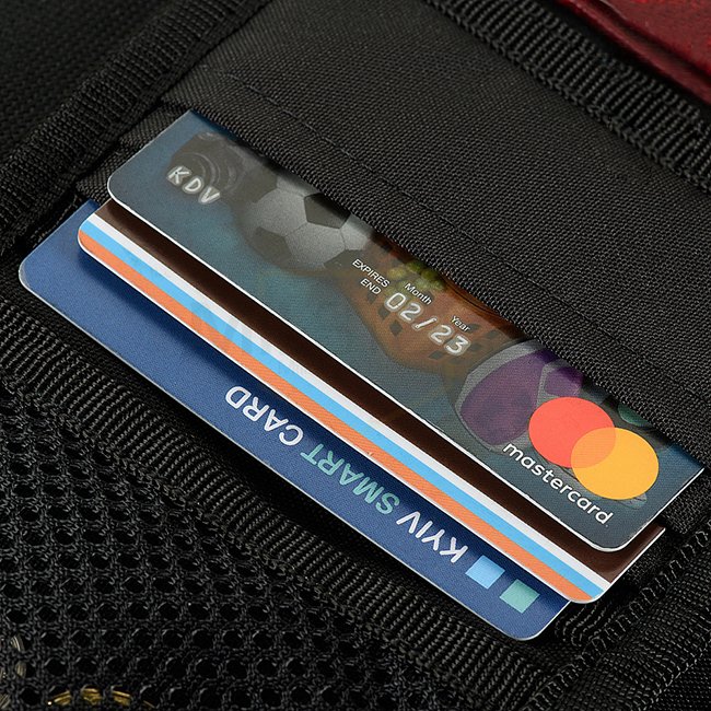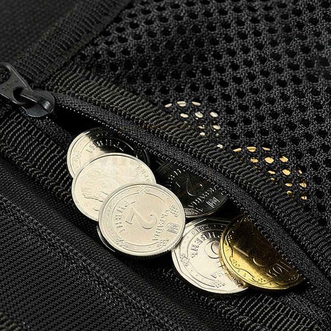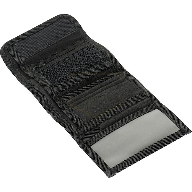 Il a deux grands compartiments pour les billets, des compartiments pour les cartes et des compartiments en plastique pour les documents. Il y a aussi une poche pour la monnaie, qui se ferme avec une fermeture éclair. Le panneau velcro avant vous permet d'attacher divers patchs.