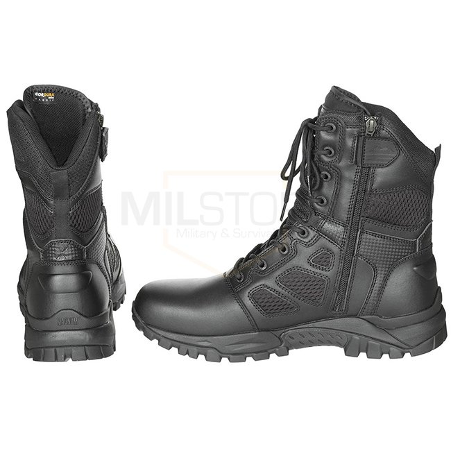Bottines Magnum Combat légères et respirantes Elite Spider X 8.0 en noir, taille 40. Comprend des aérations Cordura AFT 3D, une doublure Spidermesh, une semelle intérieure en PU M-P.A.C.T., une semelle extérieure Vibram, des fermetures éclair YKK sur les