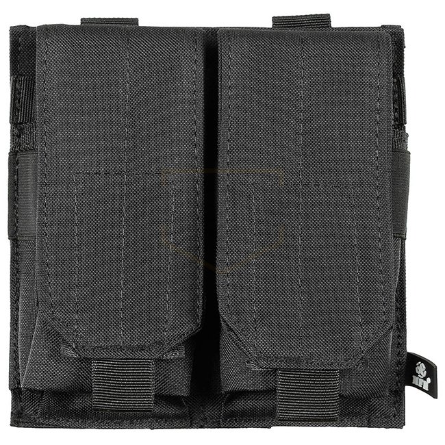 Poche à munitions MFH Double MOLLE - Noir. Rabats de couvercle réglables avec velcro, boucles élastiques centrales, 2 boucles de fixation Molle à l'arrière, avec bouton-pression. Dimensions : 8 x 17 x 5 cm (L x H x P). Matériau : 100 % polyester.