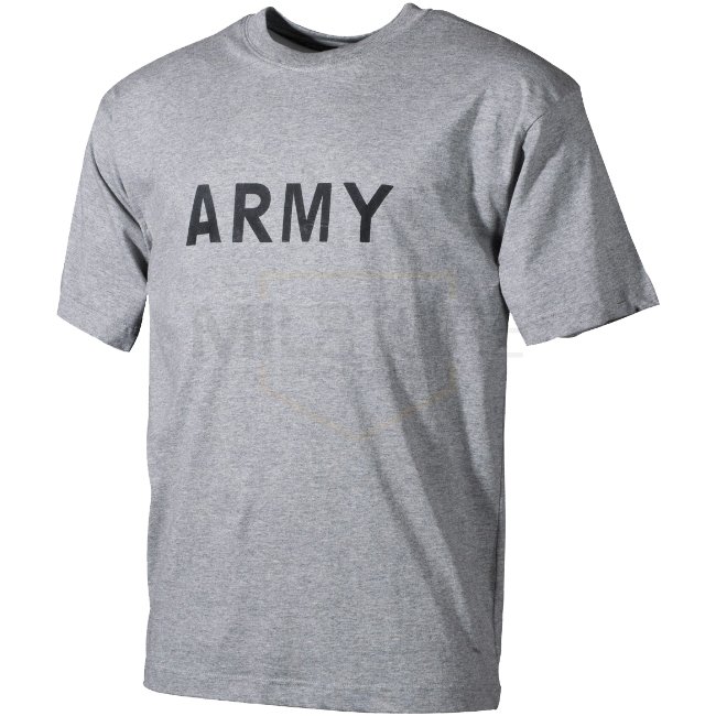 T-shirt gris à manches courtes en taille 2XL avec une impression "ARMY" jaune sur le devant. Fabriqué en jersey simple 100% coton avec un col ras du cou renforcé. 170 g/m2.
