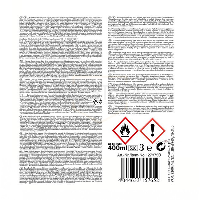 Vernis de résine de combinaison nitro pour diverses surfaces, sèche rapidement tout en offrant une finition durable. Utilisation polyvalente sur métal, bois, pierre, verre, polystyrène et plastique. Acétone et acétate de n-butyle inclus.