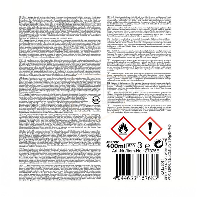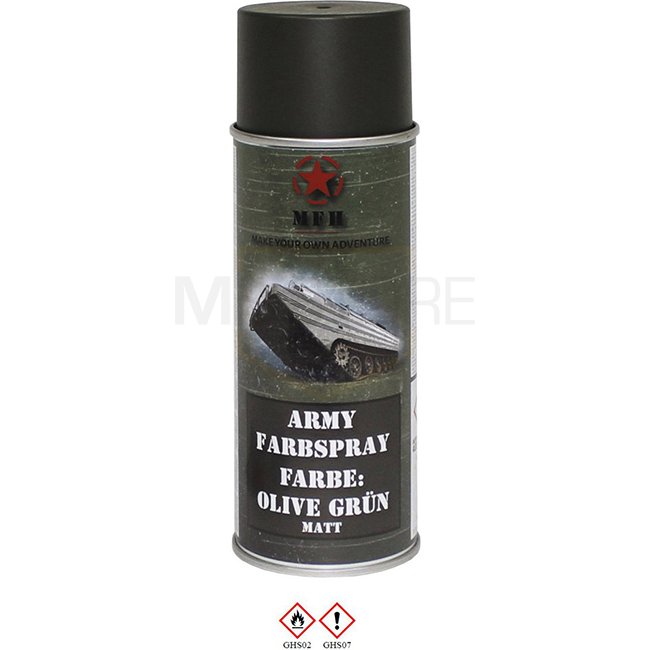 Peinture en spray MFH Army 400 ml - Vert Olive - Vernis résine nitro-combiné pour métal, bois, pierre, verre, polystyrène et plastique. Sèche au toucher en environ 20 minutes, complètement sec en environ 12 heures. RAL6014. Quantité maximale de commande =
