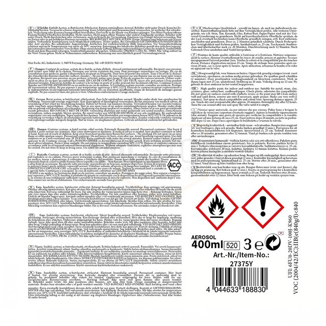 primaire de haute qualité, couleur: gris clair utilisable à l'intérieur et à l'extérieur améliore l'adhérence et l'opacité de peinture convient pour le métal, la pierre, l'argile la céramique, Verre, Rotin/Bastan, Carton/Papier Vérifier la compatibilité des substrats en plastique Ne pas pulvériser sur des surfaces Sèche à la poussière et peut revêtues de résines synthétiques, car la peinture peut se soulever. être réparé après. env. 20 minutes Quantité maximale par commande: 60 pièces