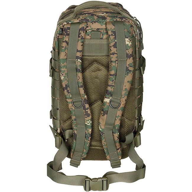 Sac à dos MFH Assault 1 - Camouflage Numérique: Bretelles ajustables et rembourrées, sangle de taille détachable, compartiment pour poche d'hydratation, rembourrage en maille respirante, multiples poches, boucles d'attache Molle. Capacité de 30L, dimensio