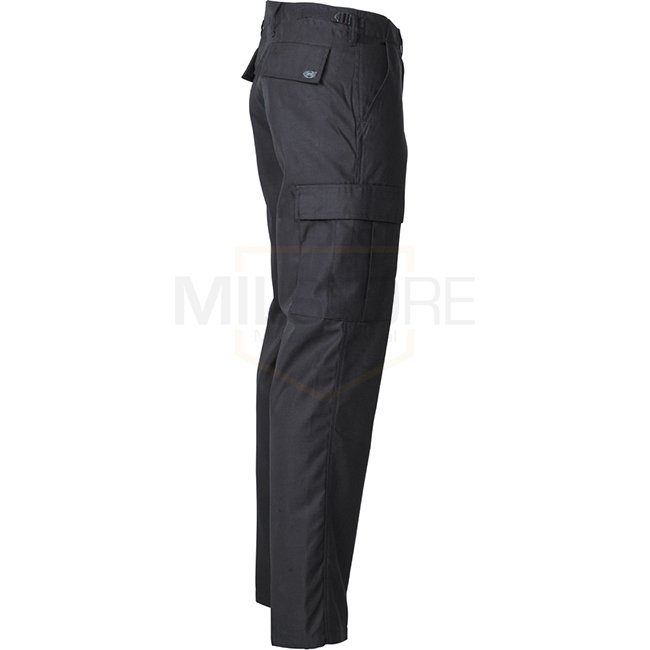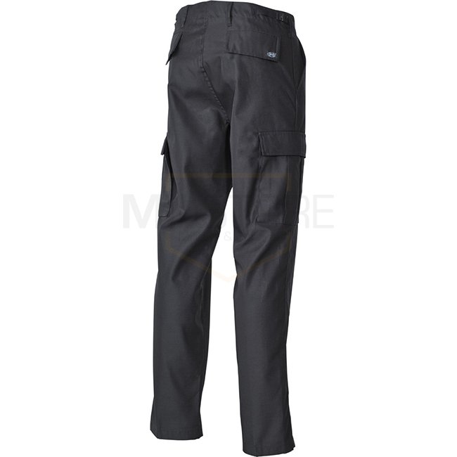 Pantalons de combat BDU MFH à poches multiples en noir classique. Comprend une fermeture éclair à l'avant, une taille ajustable et un tissu en mélange polyester-coton durable.