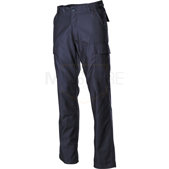 Pantalons de combat MFH BDU en bleu, taille M. Pantalons classiques de l'US ARMY avec zip frontal, plusieurs poches, taille ajustable et ourlet inférieur avec cordon de serrage. 65% Polyester, 35% Coton.