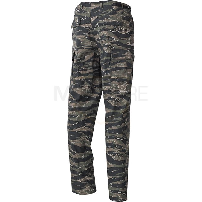 Pantalons de combat MFH BDU en motif tigre, taille S. Pantalons classiques de l'ARMÉE US en rip stop, avec fermeture à bouton, 2 poches pour les pantalons, 2 poches latérales avec rabat et boutons, 2 poches de jambe avec rabat et boutons, taille ajustable