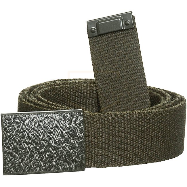 Ceinture en textile réglable de couleur olive, largeur de 30 mm, longueur maximale de 130 cm. Fabriquée en 100 % polyester.