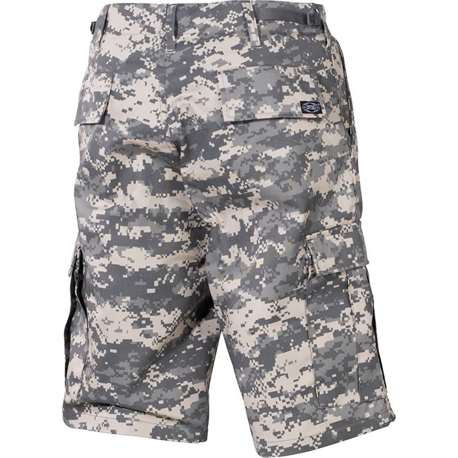 MFH BW Bermuda Shorts avec poches latérales en motif numérique AT - S. Fermeture éclair à l'avant, 6 poches, taille réglable, passants de ceinture larges. 65% polyester, 35% coton.