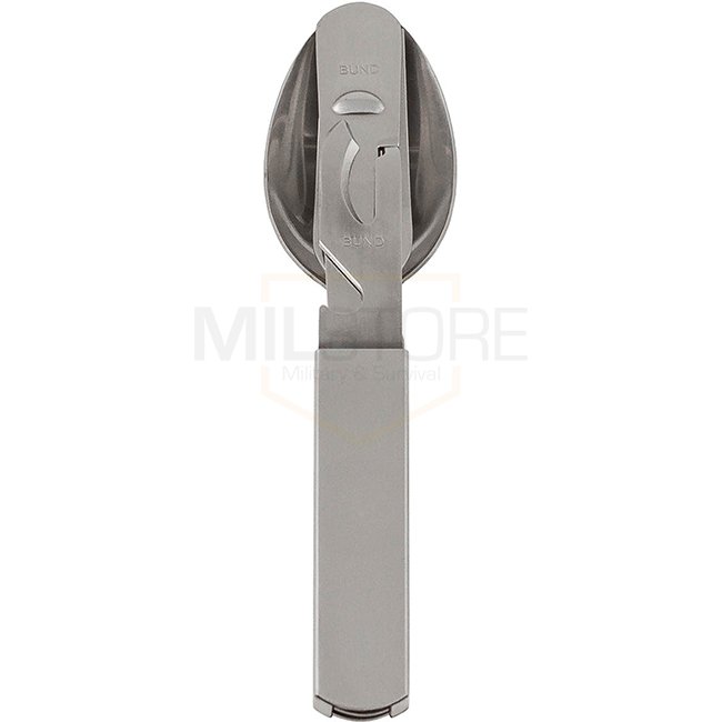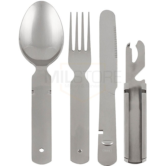 Ensemble de couverts MFH BW Version lourde : Couteau, fourchette, cuillère, ouvre-boîte/ouvre-bouteille. Longueur : 19 cm. Poids : 200 g. Acier inoxydable à 100 %.