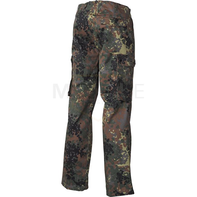 Pantalons de champ MFH BW - Flecktarn - 4. Fabriqué selon les spécifications militaires allemandes. 2 poches de jambe avec rabat et boutons-pression. 2 poches avant avec fermeture éclair. 1 poche sur la hanche avec fermeture à bouton. Passants de ceinture