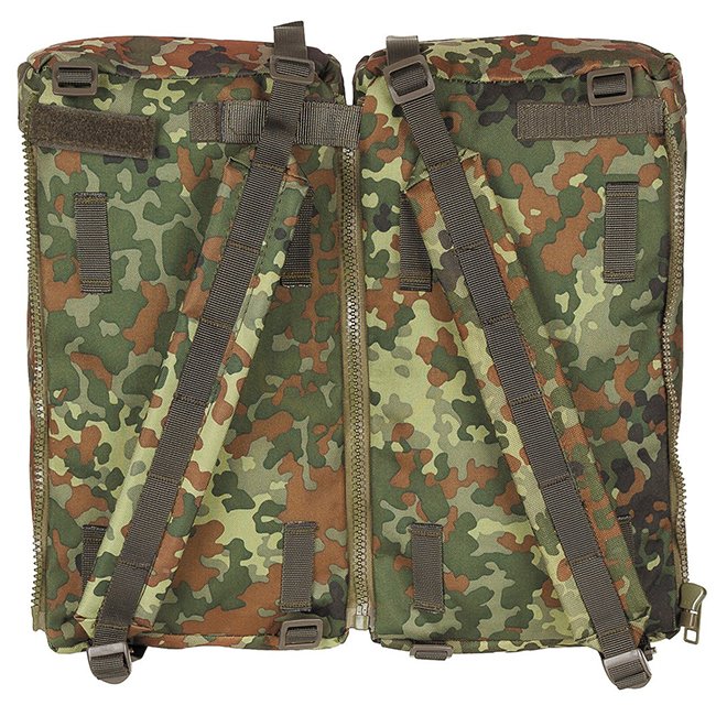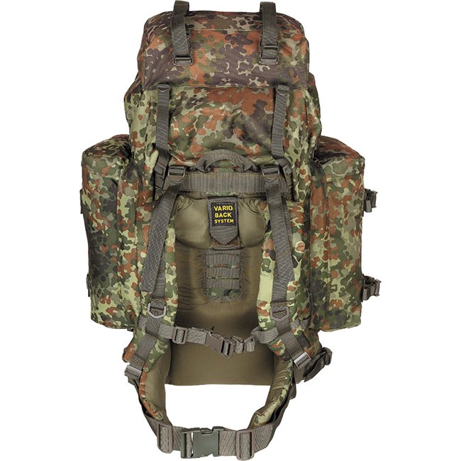 Sac à dos montagne MFH BW - Flecktarn est un sac à dos polyvalent avec des bretelles ajustables et rembourrées, des sangles de taille, un système VARIO-BACK pour l'ajustement de la hauteur des bretelles, une sangle de poitrine détachable, un cadre de stab