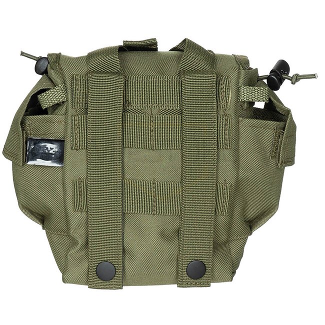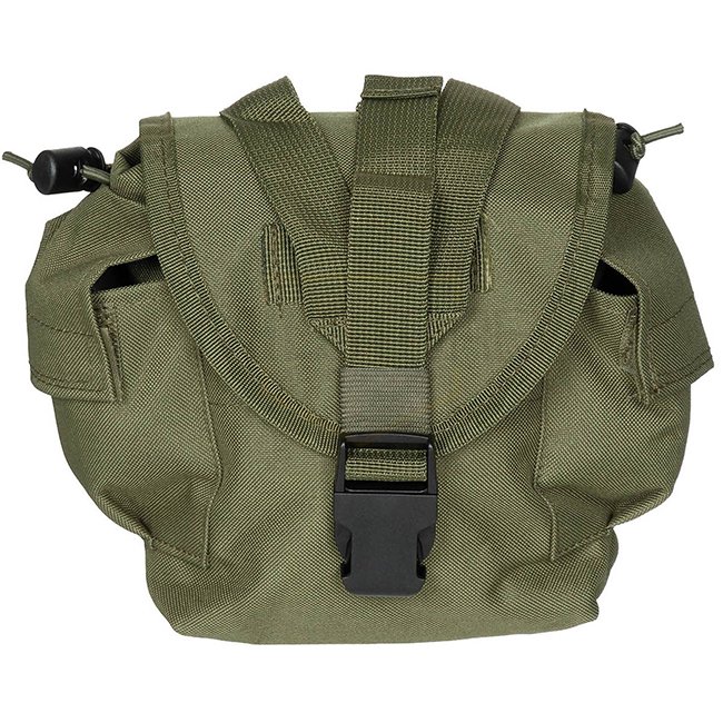 Pochette pour bouteille MFH MOLLE - Olive. Convient pour une gourde de 1 Qt, couvercle avec fermeture velcro, 1 compartiment intérieur, 2 poches avec velcro, boucles de fixation Molle à l'arrière. Dimensions : 21 x 18 x 10 cm. 100 % Polyester.