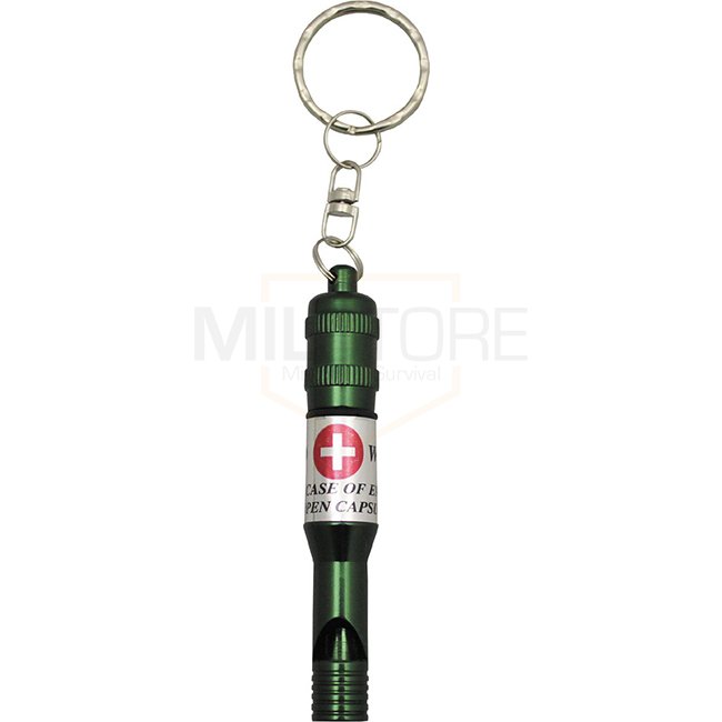 Sifflet d'urgence MFH - Olive, sifflet d'urgence compact et léger avec porte-clés intégré et manchon à vis étanche pour stocker des informations d'urgence importantes. Longueur : environ 9 cm, Poids : environ 20 g.