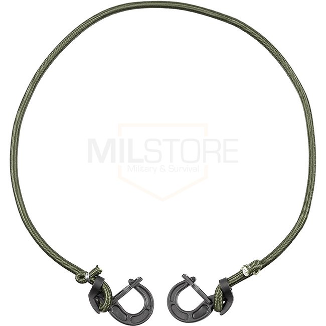 Verrou à pression MFH extensible réglable en couleur olive, 100 cm. Durable avec corde en polypropylène et en caoutchouc, crochet en polypropylène.