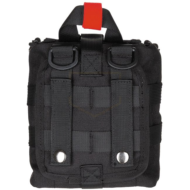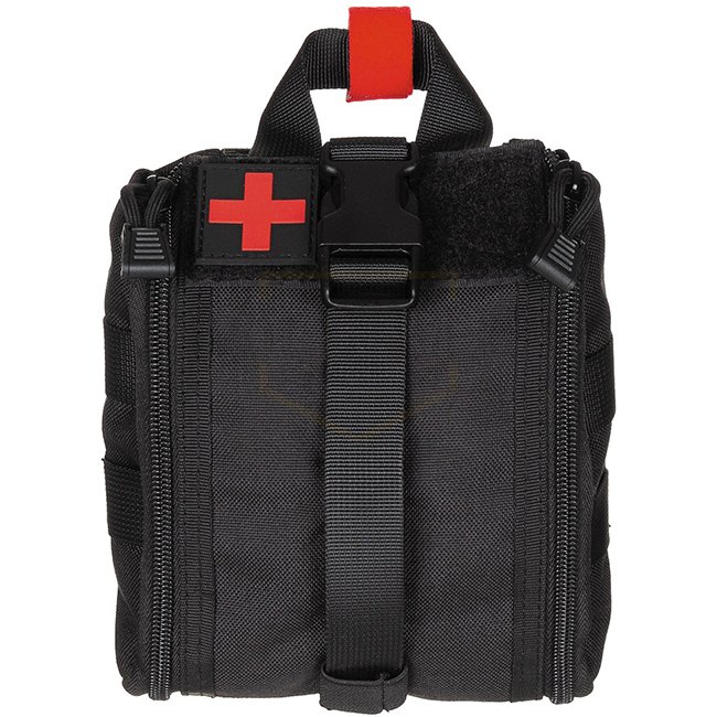 MFH Trousse de Premiers Secours Petite MOLLE - Noir : Trousse de premiers secours compacte avec plaque de transport Molle amovible, sangle de sécurité réglable et plusieurs compartiments. Panneau Velcro avec patch "Premiers Secours". Parfait pour les acti