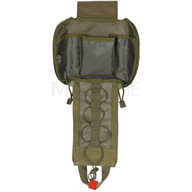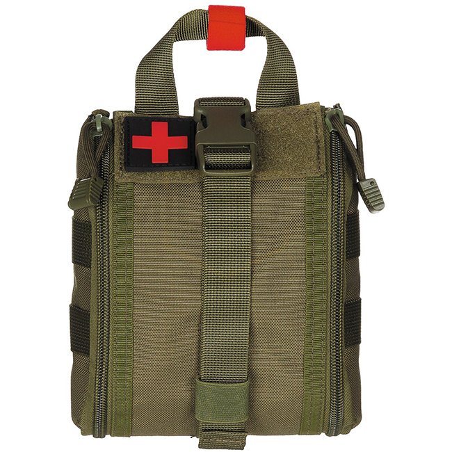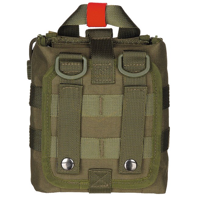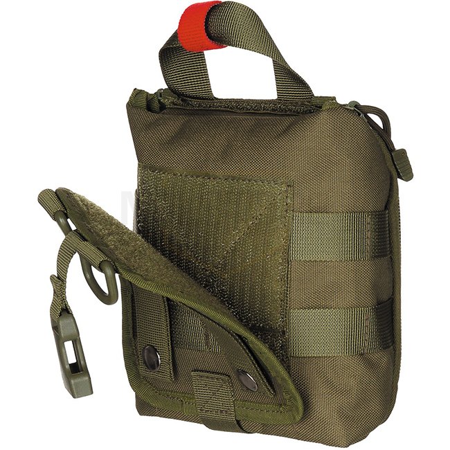 MFH Petite trousse de premiers secours MOLLE - Olive : Plaque de transport Molle amovible avec velcro et anneaux en D, boucles d'attache Molle, sangle de sécurité, divers compartiments à l'intérieur. Matériau en polyester. Dimensions : 16 x 18 x 8 cm.