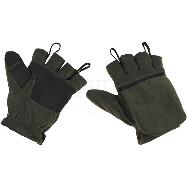 Gants en polaire avec boucles de traction, couleur olive, taille L. Capuchon de doigt repliable avec velcro, renforcé sur les paumes et les pouces. Cordon élastique avec stoppeur sur le poignet. Matériau : 100 % polyester.