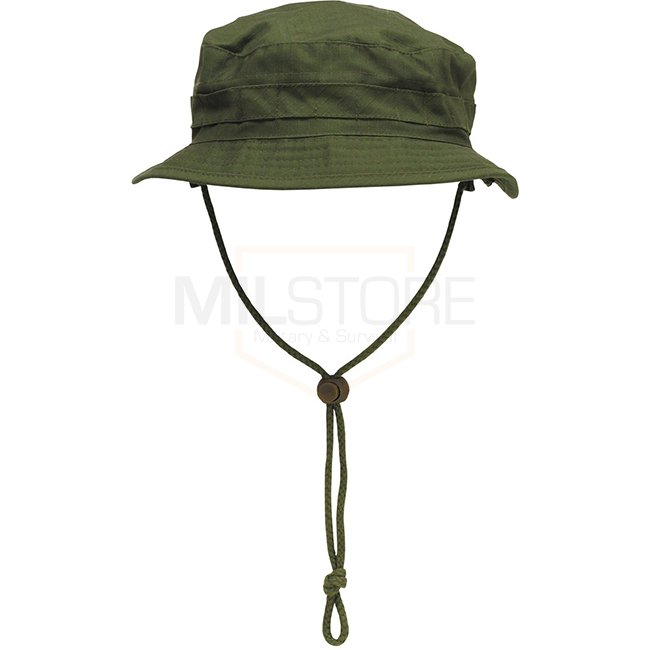 MFH GB Boonie Hat Ripstop - Olive - L: Chapeau Boonie classique de l'armée GB avec bord matelassé, boucles périphériques, sangle de menton avec bloque cordon. Fabriqué en 65% Polyester et 35% Coton.