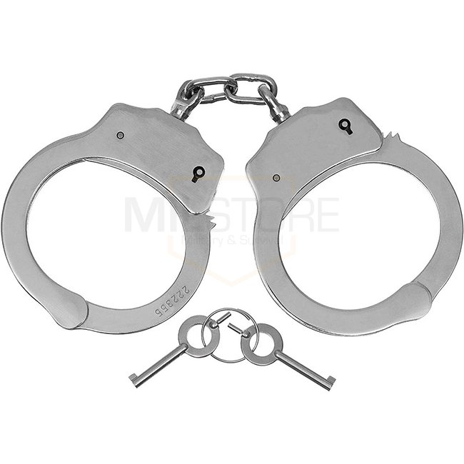 Menottes classiques en chrome avec "double-verrouillage", deux menottes symétriques, et une chaîne avec pivot. Fabriquées en acier 100%. Longueur environ 23 cm.