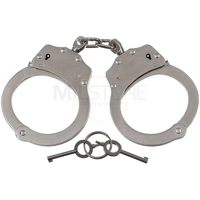 Menottes en chrome de haute qualité avec "double verrouillage", menottes symétriques et rainure de verrouillage. Équipées de chaînes avec deux maillons soudés comportant un roulement pivotant. Longueur d'environ 23 cm. Fabriquées en acier 100%.