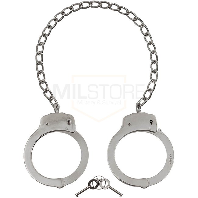 Menottes en chrome de haute qualité avec "double-verrouillage", 2 menottes symétriques et chaîne à maillons soudés. Longueur totale : environ 68 cm. Matériau : 100% Métal.