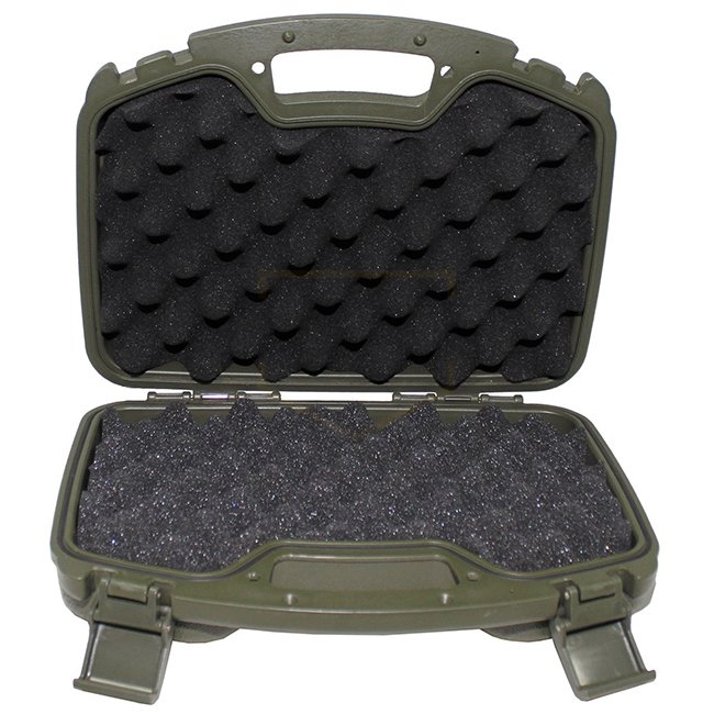 Protégez vos grands pistolets dans cette mallette en plastique verrouillable de couleur olive. Antichoc, résistant aux éclaboussures avec un insert en mousse d'œuf. Fermetures à pression, poignée, œillets de verrouillage, couvercle avec joint en caoutchou