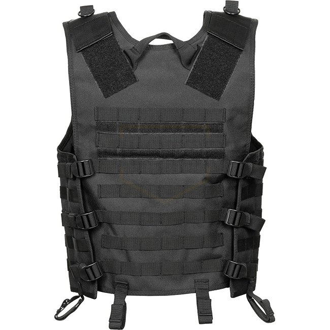 Gilet Tactique MFH MOLLE Light - Noir : Gilet tactique avec système modulaire, fermeture éclair durable avec fermeture à clip, ajustable sur l'épaule, boucles Molle, panneaux velcro, poignée de secours, 6 boucles de ceinture, 3 poches intérieures. 100% Po