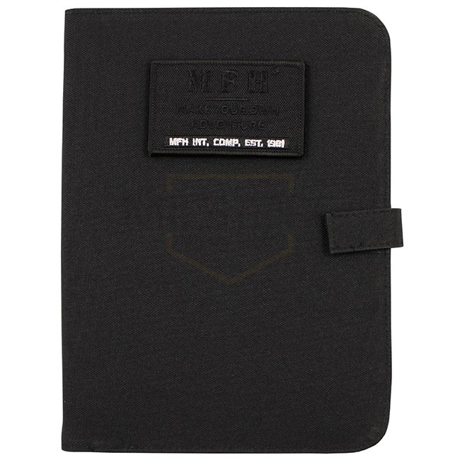 MFH Cahier A5 - Noir : Cahier A5 élégant et fonctionnel avec panneau velcro, compartiments coulissants, porte-stylos et un classeur à anneaux amovible. Fabriqué en polyester durable à 100 %. Dimensions : 24 x 17,5 x 3 cm.