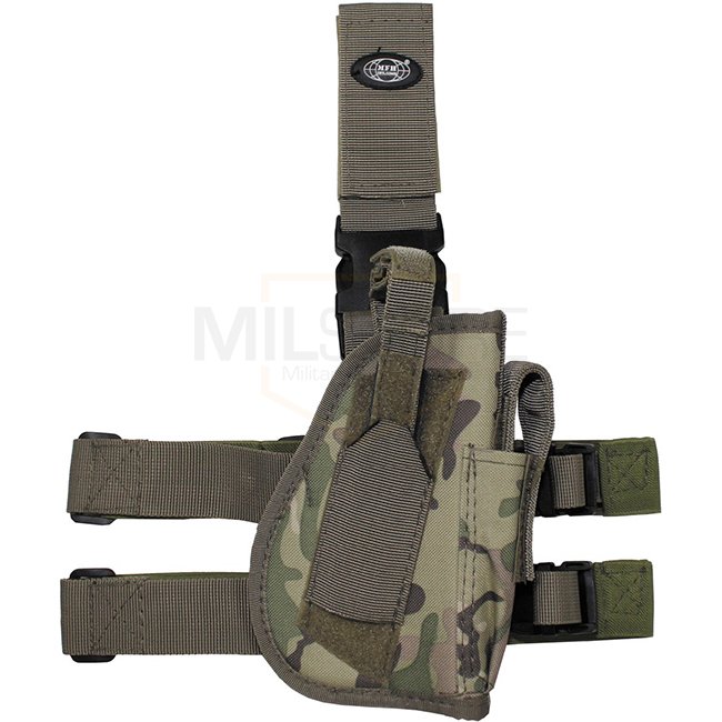 Holster de jambe MFH pour pistolet Standard Main Droite - Camouflage Opération : Holster de jambe avec sangles réglables et poche à chargeur. 100% Polyester.