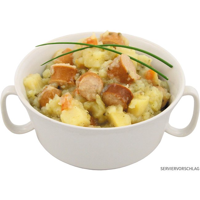 Des ingrédients indigène Artisanalement fabriqué à Allemagne Sans agent de conservation et exhausteurs de goût Sans aucun traitement de viande séparée Non refroidi 10 ans conservable !!! Stocker au sec et température ambiante Ingrédients: 85 % soupe de pommes de terre: pomme de terre, eau potable,sel gemme, bouillon de légumes, lard, oignon, poivre,sucre, origan , persil , légume 15 % saucisse de Francfort: porc,eau potable, sel de table, épices, (contiene moutarde) extraits d'épices, glucose, stabilisant: diphosphate, antioxydants: acide ascorbique, nitrite de sodium, boyaux de mouton, fume du bois de hêtre,( le céleri peut contenir) indication de pourcentage au moment de l'utilisation Valeur nutritives pour 100g: Valeur calorique physiologique 1378 kJ ,332 kcal Graisse 26,35g, acide gras saturé 10,53g Glucides 8,02g, le sucre 1,58g Protéine 15,21g, sel 3,00g 03/2031 |