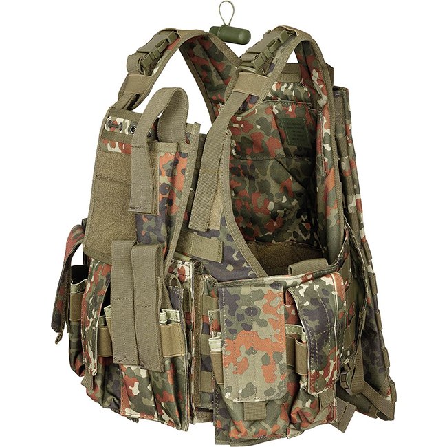 Gilet tactique avec système d'hydratation intégré et ajustement réglable, présentant diverses pochettes pour munitions et composants détachables pour une utilisation polyvalente. Fabriqué en 100 % polyester. Le système de boucles Molle offre des options d