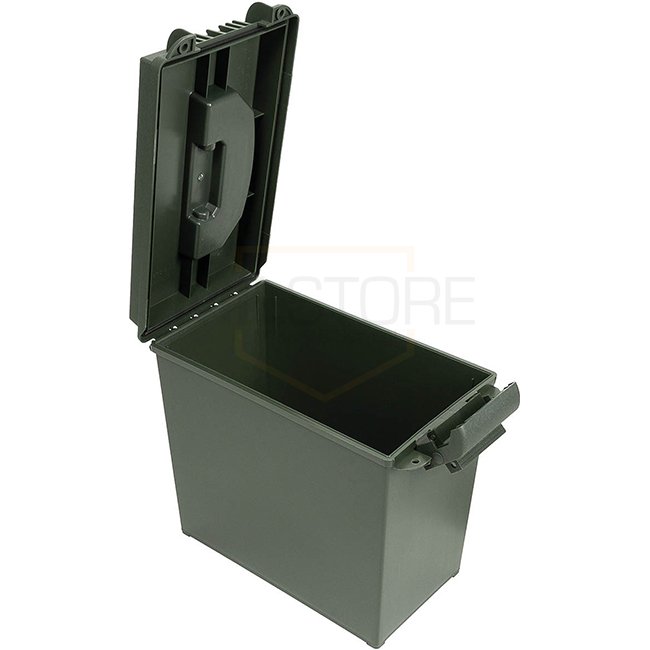 Boîte à munitions US MFH de haute qualité fabriquée en plastique durable, idéale pour stocker et transporter de grands objets. Dotée d'un design étanche et antichoc, avec un couvercle sécurisé, un verrou à pression, des œillets de verrouillage, une poigné