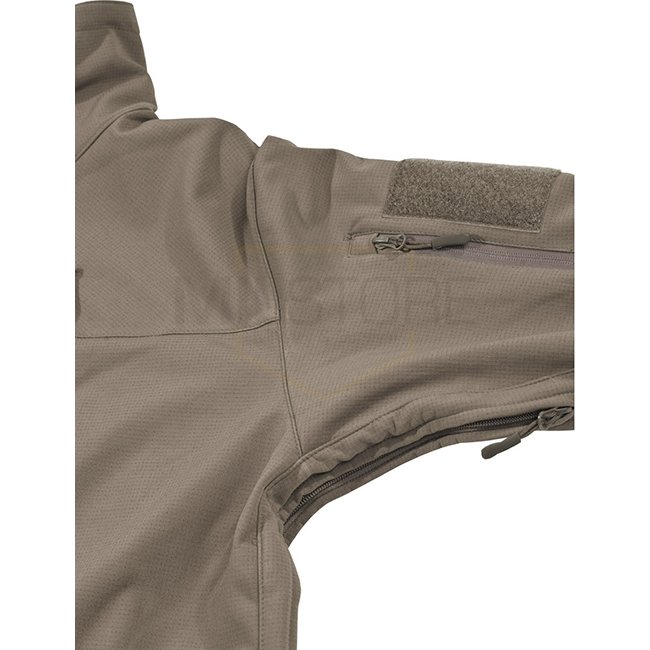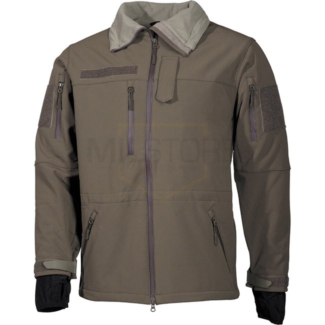 MFHHighDefence Veste Soft Shell HIGH DEFENCE en Olive - S. Imperméable, coupe-vent, respirante, avec fermeture éclair 2 voies dissimulée, plusieurs poches, panneaux velcro, caractéristiques réglables, coudes renforcés et zips étanches. Matériel : 94 % Pol